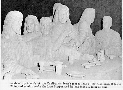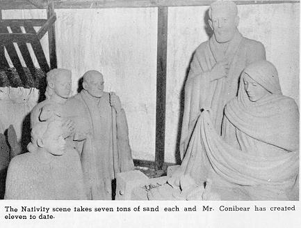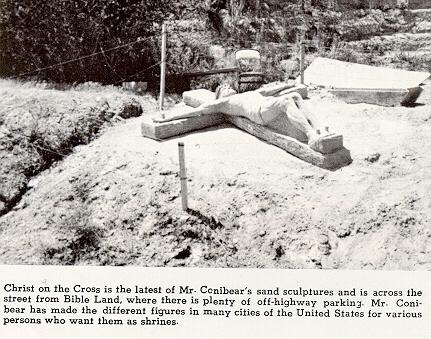 Ted Conibear, artist, who makes the life sized statues of Biblical characters out of tons and tons of sand and water, has once more fashioned a great piece of art-a life-sized statue of Christ as he was nailed to the cross.