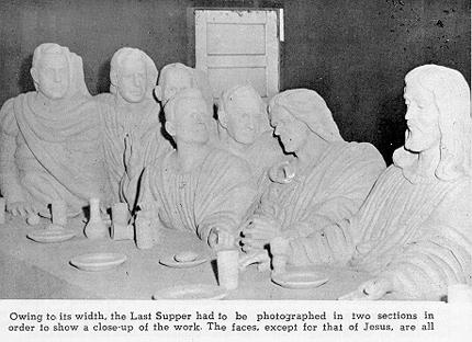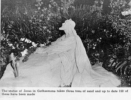 Bible Land itself sets off of Highway 395, down a narrow winding road that leads to what well must have been similar to the Garden of Eden, for it is a valley of trees, small tame animals and in the center housed under lean-to type structures one can behold the statue of Jesus in Gethsemane, the Last Supper and many more fabulously sculptured works of Ted Conibear.